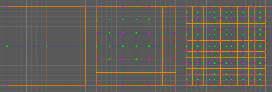 Patches are smooth one-sided surfaces used to represent curved objects such as vaulted ceilings, pillars or cave interiors. A patch is defined by a number of Bezier control points, and offers control over the level of detail used when subdividing the patch into triangles for rendering: more triangles will produce a smoother surface but may lower rendering performance.